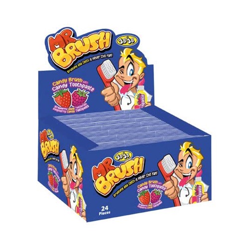 MR. BRUSH CONTIENE 1 TUBETTO DI CARAMELLE GEL DENTIFRICIO GUSTO FRAGOLA IN PIU' LO SPAZZOLINO E' UNA VERO E PROPRIO LECCA LECCA.