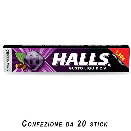 HALL'S: LA VARIETA' DELLA GAMMA COOL. UN'ESPLOSIONE DI GUSTO E FRESCHEZZA.HALL'S ALLA MASSIMA POTENZA CON IL GUSTO DI LIQUIRIZIA. DONA UN'AZIONE RINFRESCANTE PER LA GOLA. SENZA ZUCCHERO.CONFEZIONE DA 20 STICK.