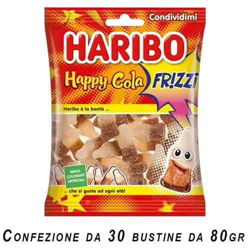 CARAMELLE GOMMOSE HARIBO: TRAVOLGENTI, COLORATE E IRRESISTIBILMENTE GUSTOSE!HARIBO HAPPY COLA FRIZZI SONO CARAMELLE GOMMOSE AL GUSTO DI COLA E LIMONE A FORMA DI BOTTIGLIETTA.CARTONE DA 30 PEZZI.