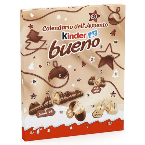kinder calendario avvento misto gr 181 contiene : 12 kinder bueno mini ; 8 kinder bueno white mini ; 3 eggs kinder bueno ; 1 kindr bueno.