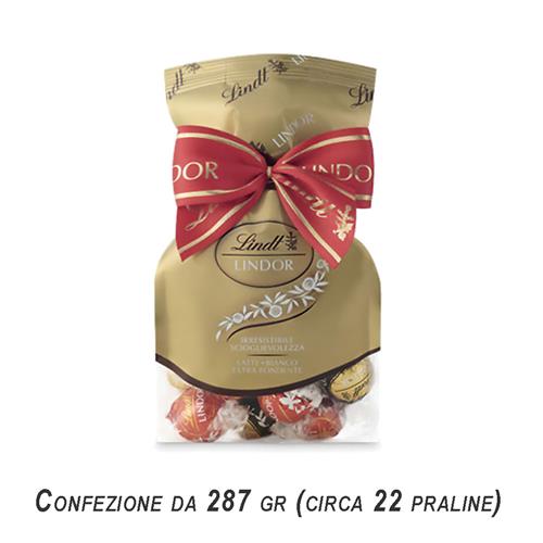 Sacchetto LINDOR assortito 287 gr è un sacchetto da 287 gr che contiene tutta l'irresistibile scioglievolezza dell'iconico cioccolato LINDOR : un guscio croccante di finissimo cioccolato Lindt che contiene un morbido ripieno dall'irresistibile scioglievolezza. Dal 1949 i Maîtres Chocolatiers Lindt avvolgono con cura ogni LINDOR, per regalarti un momento di irresistibile scioglievolezza. Da regalare e regalarti ogni volta che vuoi.
