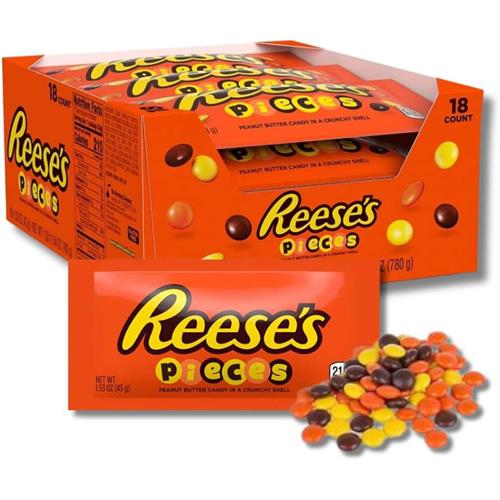Reese's Pieces sono dei piccoli confetti di cioccolato al latte ripieni di cremoso burro d'arachidi e ricoperti da uno strato di caramella croccante. CONFEZIONE DA 18 PEZZI.