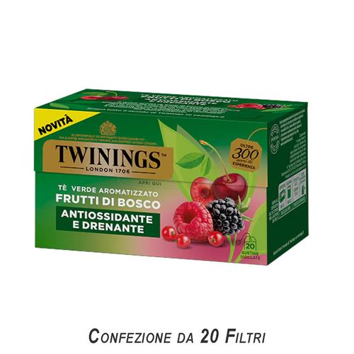 TWININGS TE VERDE FRUTTI DI BOSCO : IL DOLCE AROMA DI FRUTTI DI BOSCO SI UNISCE ARMONIOSAMENTE CON IL PROFUMO AVVOLGENTE E RICCO DEL TE' VERDE , CREANDO UN CONNUBIO PERFETTO. DAL SAPORE FRESCO E INTENSO , QUESTO TE' VERDE E' ANTIOSSIDANTE E CONTRIBUISCE AL DRENAGGIO DEI LIQUIDI CORPOREI.