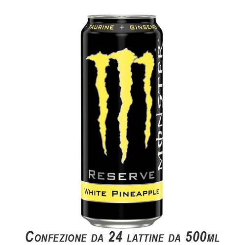 MONSTER RESERVE WHITE PINEAPPLE: BEVANDA ENERGETICA DAL GUSTO DOLCE E ASPRO DELL'ANANAS. SI TRATTA DI UN GUSTO TANTO SEMPLICE QUANTO IRRESISTIBILE, NON APPENA APRI LA LATTINA SI SENTE IL PROFUMO DELL'ANANAS.CONFEZIONE DA 24 PEZZI DA 500 ML.