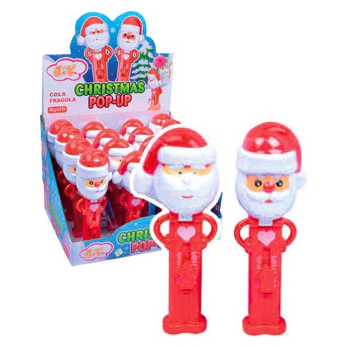 CHRISTMAS POP UP E' UN GIOCATTOLO CON LECCA LECCA AL GUSTO DI FRAGOLA E COCA COLA. PREMI LA LEVA DEL GIOCATTOLO E GUSTA IL LECCA LECCA.