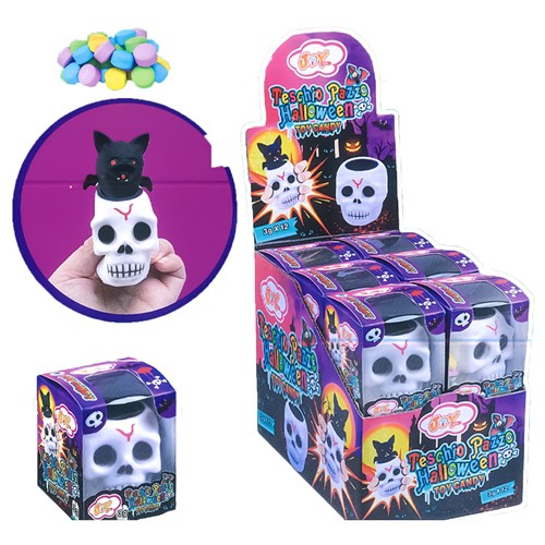 TESCHIO PAZZO HALLOWEEN : DIVERTITI SCHIACCIANDO TRA LE MANI IL TESCHIO DI GOMMA MORBIDA E VEDRAI CHE DALLA TESTA FUORIESCE UNO SPAVENTOSO PIPISTRELLO.