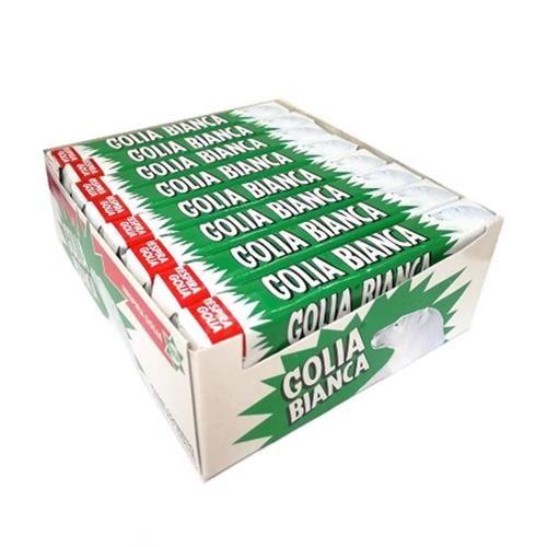 GOLIA: MARCHIO STORICO ITALIANO NATO NEGLI ANNI '30.GOLIA BIANCA E' UN CONFETTO CROCCANTE FUORI AL GUSTO DI MENTA E TENERO DENTRO AL GUSTO DI LIQUIRIZIA. CONFEZIONE DA 24 STICK.