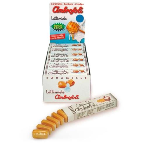 Le caramelle LatteMiele Ambrosoli hanno il gusto genuino e delizioso delle cose semplici. Uniscono la delicatezza del miele con la bontà del latte per un risultato unico. Queste caramelle dalla consistenza dura racchiudono un golosissimo ripieno per un’eplosione di sapore.confezione da 24 pezzi.