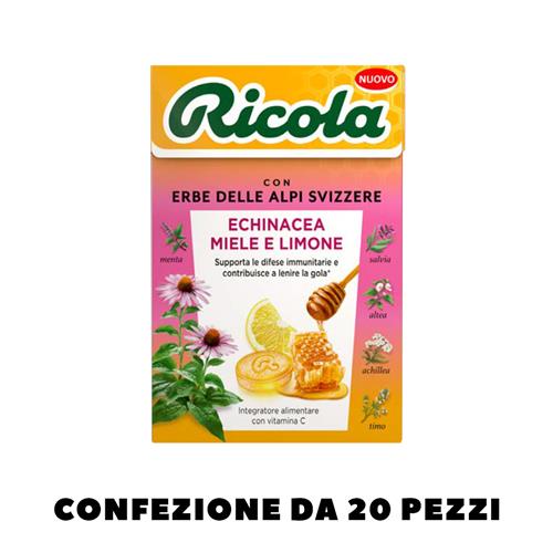 RICOLA ECHINACEA, MIELE E LIMONE E' LA NUOVA CARAMELLA COMPLETA: UN INTEGRATORE ALIMENTARE RICCO DI VITAMINA C, CON UNA SERIE DI VANTAGGI IN PIU' DATI DALL'ESTRATTO NATURALE DI ECHINACEA PURPUREA, DALLA NATURALE DOLCEZZA DEL PURO MIELE E DAL RINFRESCANTE LIMONE.