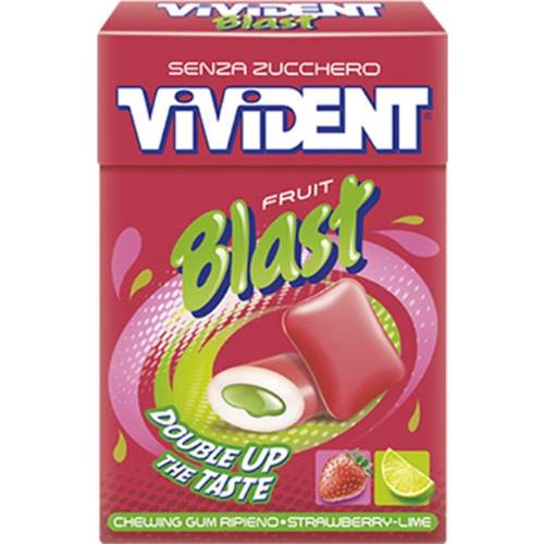 VIVIDENT BLAST E' UNA GAMMA COMPLETA DI CHEWING GUM SENZA ZUCCHERO. VIVIDENT BLAST E' IL CHEWING GUM RIPIENO CHE RACCHIUDE IN UN CONFETTO CROCCANTE UN CUORE LIQUIDO, PER UN ONDATA DI GUSTO E FRESCHEZZA. AL GUSTO DI FRAGOLA. CONFEZIONE DA 20 ASTUCCI.