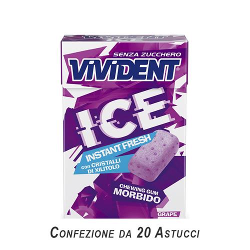 VIVIDENT ICE GRAPE IL NUOVO CHEWING GUM MORBIDO SENZA ZUCCHERO. FIN DAL PRIMO MORSO SCOPRI LA SUA INCREDIBILE MORBIDEZZA E LASCIATI AVVOLGERE DALLA SUA INTENSA ED IMMEDIATA FRESCHEZZA GRAZIE AI CRISTALLI DI XILITOLO. VIVI LA NUOVA CHEWING EXPERIENCE!CONFEZIONE DA 20 PEZZI.