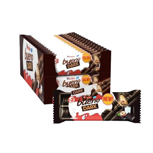 KINDER BUENO DARK è lo snack dal gusto inconfondibile che coniuga un goloso ripieno alla nocciola con la friabilità di una sottile sfoglia di wafer, il tutto ricoperto di cioccolato EXTRA FONDENTE. Con KINDER BUENO ti godi una pausa di gusto!CONFEZIONE DA 30 PEZZI.