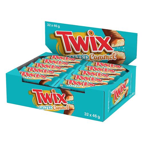 TWIX SALTED CARAMEL E' UNA BARRETTA DI CIOCCOLATO, CONSISTENTE IN UN BISCOTTO LUNGO, RIPIENO DI CARAMELLO SALATO E RICOPERTO DI CIOCCOLATO AL LATTE.CONFEZIONA DA 32 PEZZI.